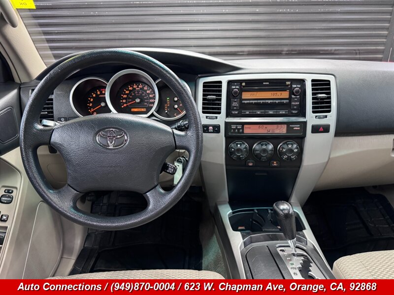 2007 Toyota 4Runner SR5 — equipado con un confiable motor 4.0L V6 (236 hp, 266 lb-ft). De fábrica incluye transmisión automática de 5 velocidades, opción de tracción 4WD a demanda, asientos de tela con respaldo trasero abatible, aire acondicionado, control de velocidad, elevalunas y seguros eléctricos, entrada remota sin llave, radio AM/FM con lector de CD y entrada auxiliar, rines de aleación y barras de techo, rueda de repuesto de tamaño completo, frenos ABS y múltiples bolsas de aire, además de preparación para remolque. Este vehículo tiene menos de 159,000 millas (promediando menos de 8,000 millas por año), está en excelente estado general y cuenta con un CARFAX limpio — listo para muchos kilómetros más con una conducción confiable y amigable.