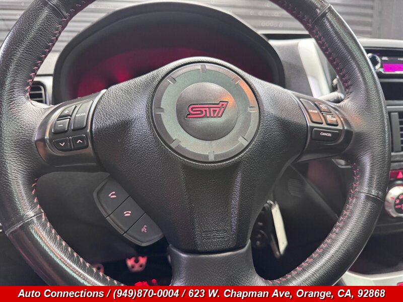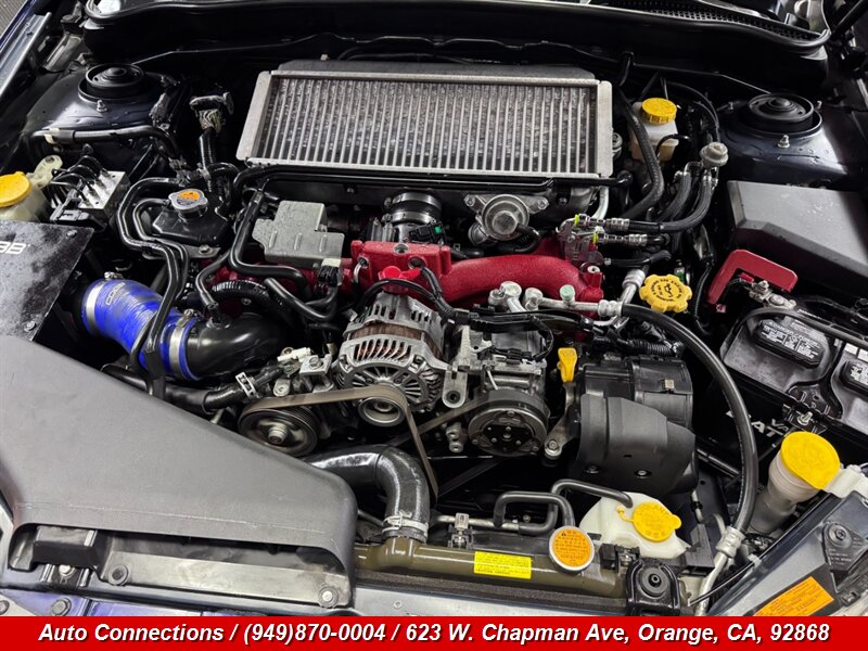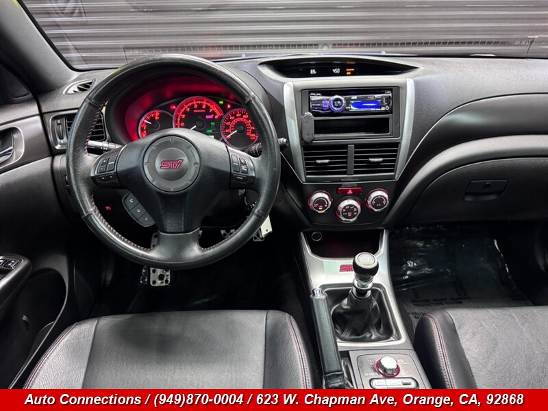 2011 Subaru Impreza WRX STI Limited — 2.5L Turbo H4 producing 305 hp and 290 ft-lbs, paired with a 6-speed manual and Symmetrical All-Wheel Drive with Driver Controlled Center Differential (DCCD). Factory equipment includes high-performance Brembo brakes, sport-tuned suspension with front and rear limited-slip differentials, 18-inch alloy wheels, HID headlights and fog lamps, leather-trimmed heated front seats with power driver adjustment, dual-zone automatic climate control, cruise control, and a factory audio system with CD/AUX (navigation and premium audio were available as factory options). Below 92,000 miles (averaging under 6,000 miles/year), excellent overall condition, clean CARFAX, one owner.