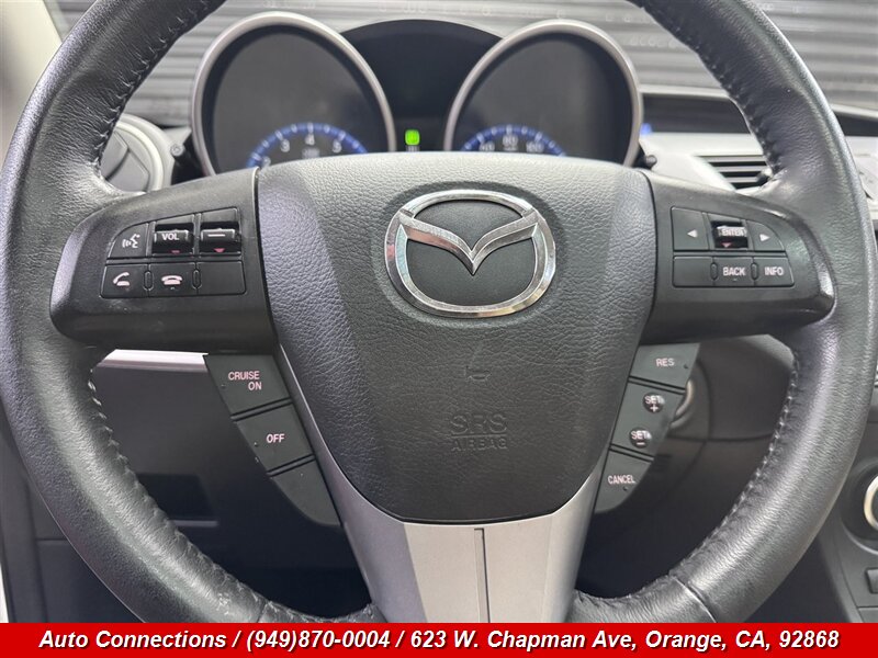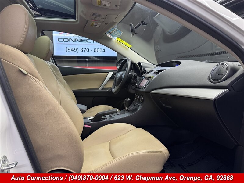 2013 Mazda Mazda3 i Grand Touring — impulsado por SKYACTIV-G 2.0L I4 (155 hp, 148 lb-ft). Equipamiento de fábrica incluye una transmisión de 6 velocidades suave (automática o manual disponible), asientos delanteros calefactables con tapicería de cuero y ajuste eléctrico para el conductor, volante multifunción con controles de audio y Bluetooth, sistema de audio premium Bose con entradas USB/AUX y reproducción por Bluetooth, llantas de aleación, faros automáticos con luces diurnas LED y antiniebla, entrada sin llave con botón de arranque, y paquete completo de seguridad que incluye ABS, control de tracción y estabilidad, múltiples airbags y monitorización de la presión de los neumáticos. Excelente estado general, menos de 69,000 millas (promedio inferior a 5,000 millas/año), CARFAX limpio y un solo propietario.