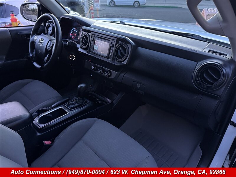 2018 Toyota Tacoma SR powered by a 2.7L I4 (159 hp / 180 lb-ft) — well maintained and in excellent overall condition with a clean CARFAX. Factory-standard equipment includes the 2.7L four-cylinder with available 6-speed manual or 6-speed automatic transmission and rear-wheel drive with available part-time 4WD; multi-stage driver and front passenger airbags plus side and curtain airbags; ABS with electronic stability and traction control; tire pressure monitoring and a rearview backup camera. Comfort and convenience features from the factory include cloth seating, power windows and door locks, remote keyless entry, cruise control, AM/FM audio with Bluetooth and USB/AUX connectivity, a practical center console and storage, and a fold-down 60/40 rear seat (Double Cab). Bed tie-downs and a durable tailgate finish the factory package.